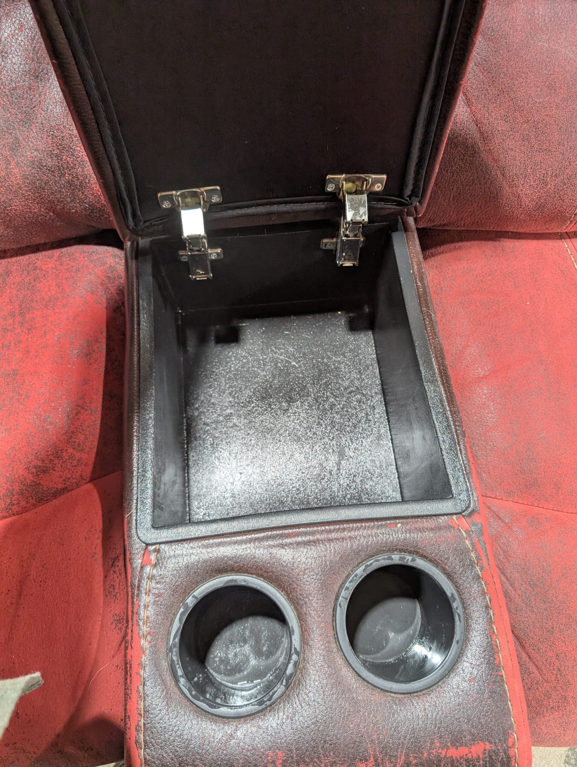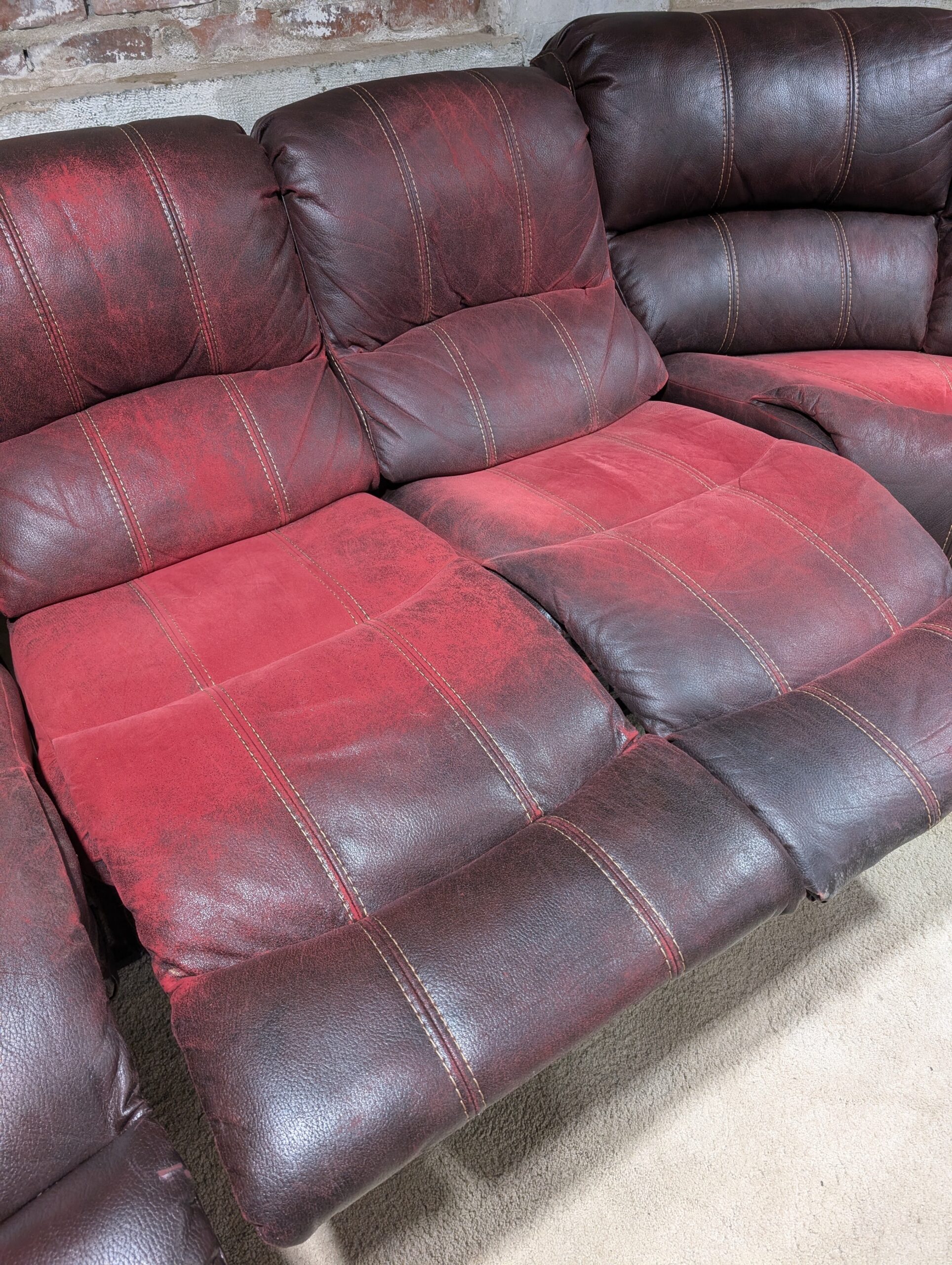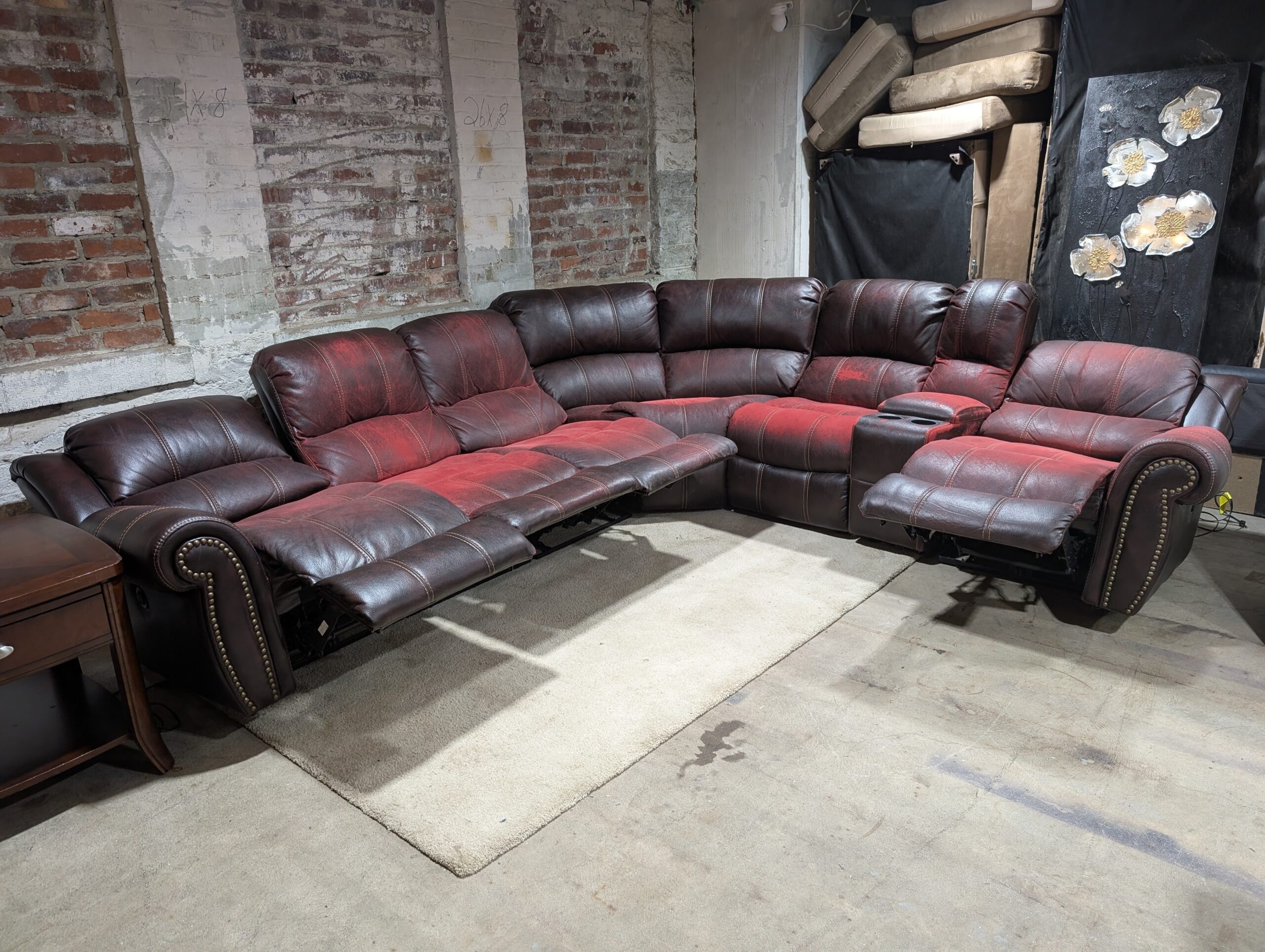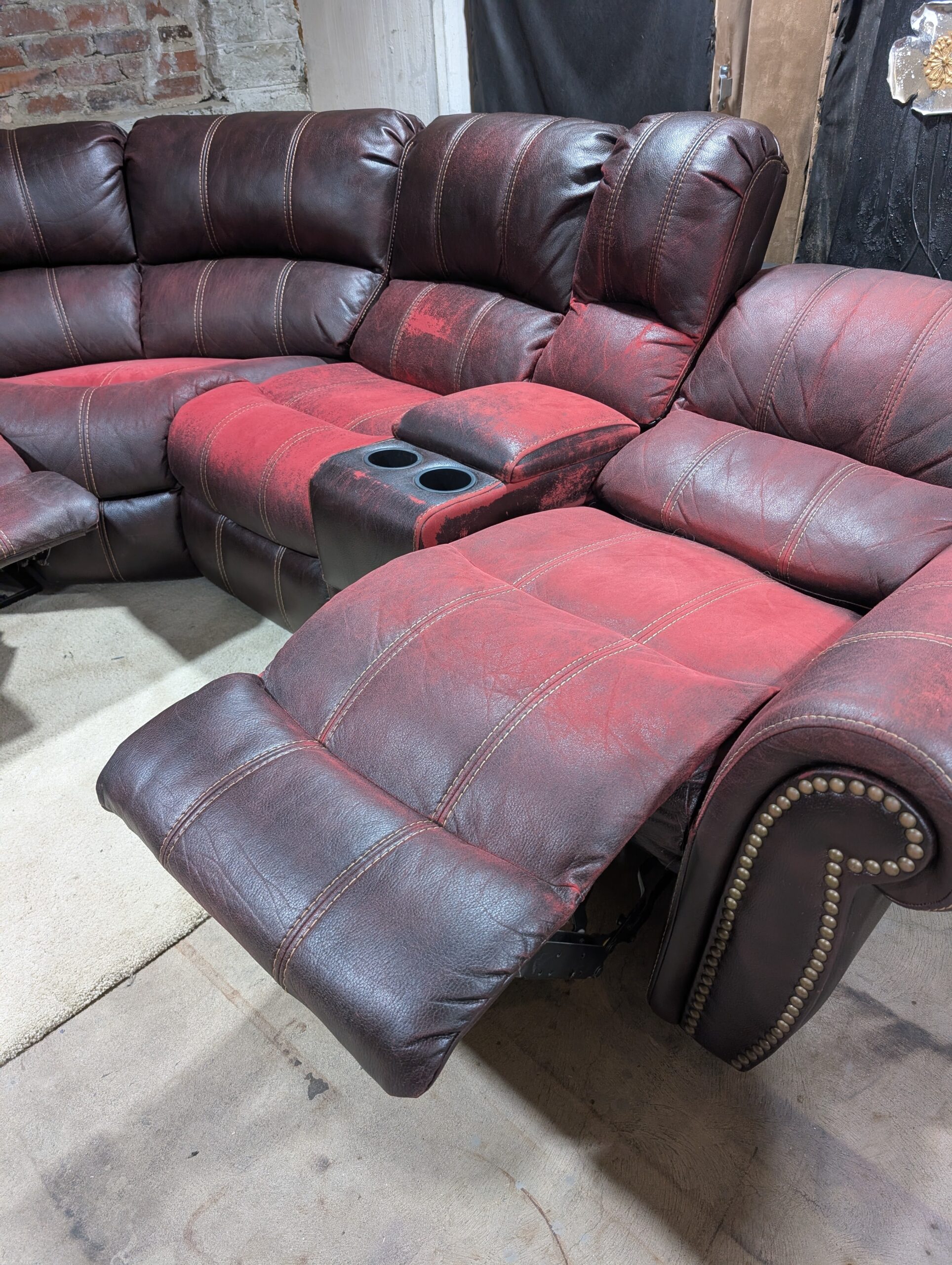 Brown and Red Cloth and Leather Recliner Sectional